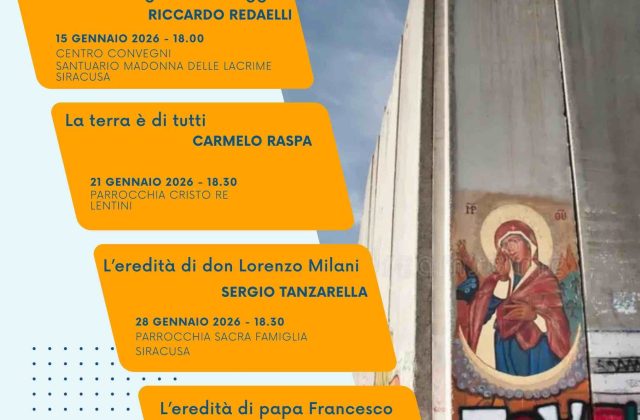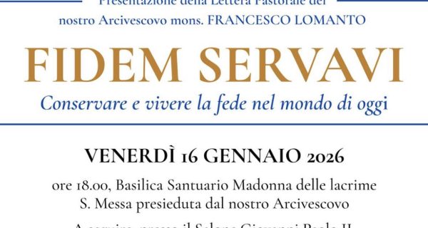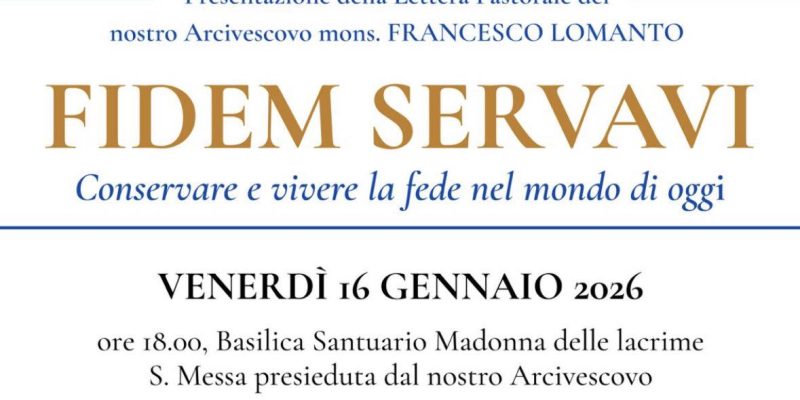 Venerdì 16 gennaio sarà presentata al vicariato di Siracusa la quinta Lettera Pastorale dell’arcivescovo mons. Francesco Lomanto intitolata “Fidem Servavi”. Alle ore 18.00 nella Basilica Santuario Madonna delle lacrime messa presieduta dall’arcivescovo . Seguirà…