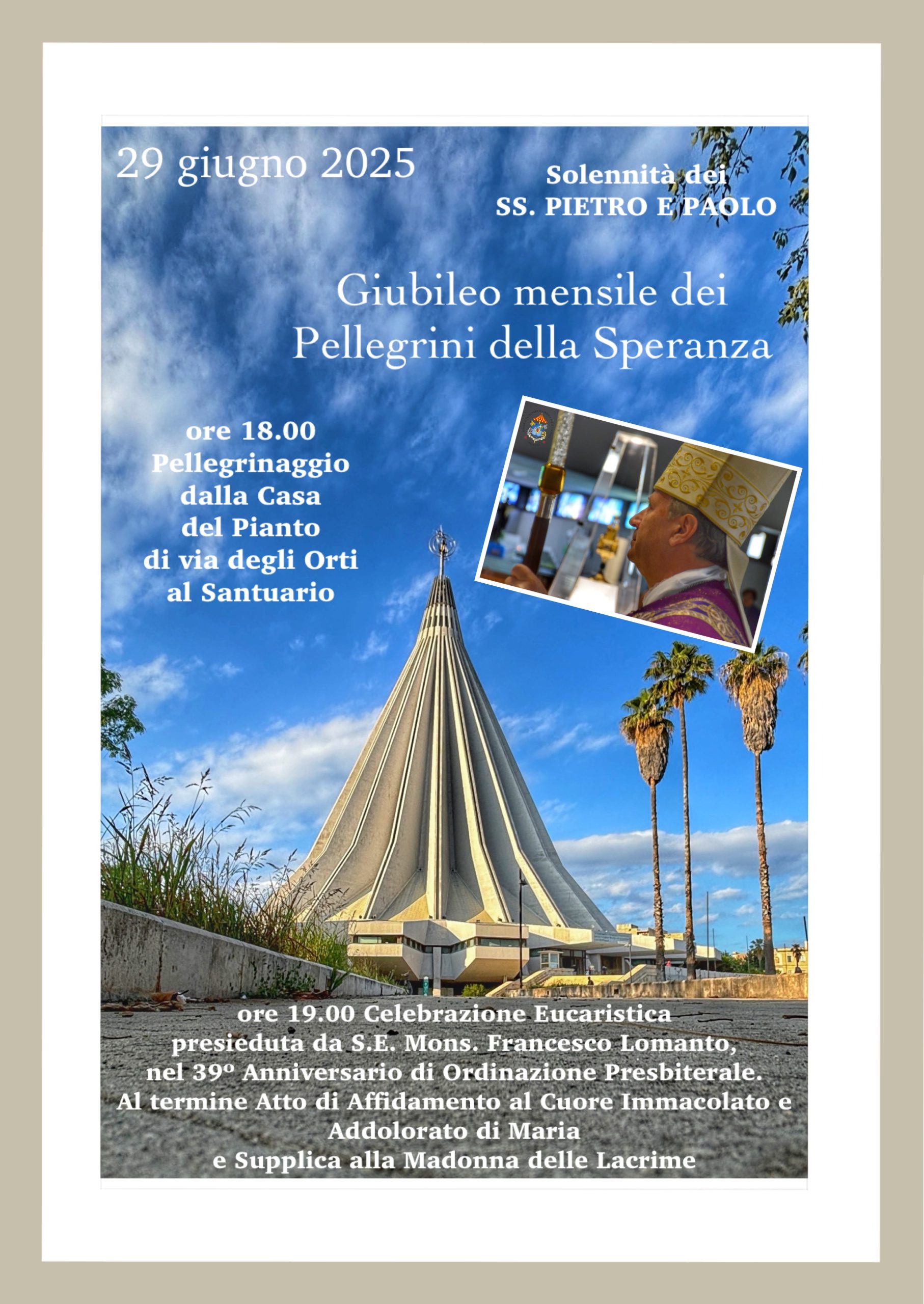 Domenica i fedeli potranno partecipare al Giubileo mensile dei pellegrini di Speranza, che si terrà dalla Casa del Pianto al Santuario. Alle ore 18.00 pellegrinaggio a piedi dalla Casa del Pianto al Santuario. Alle ore 19.00 Santa Messa in Basilica, presieduta dall’arcivescovo Lomanto.