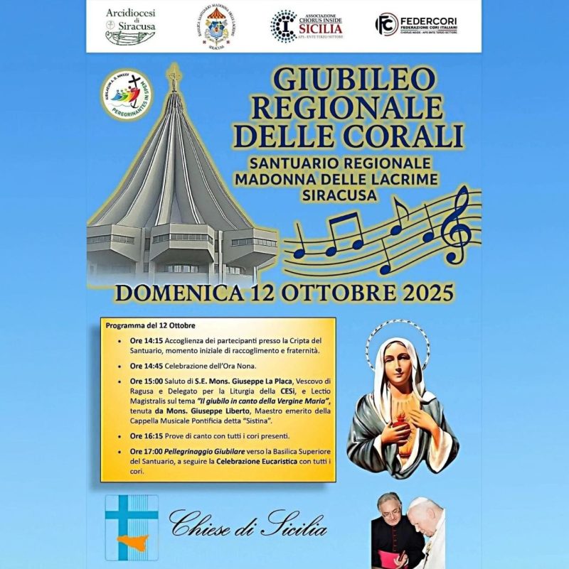 Così il vescovo di Ragusa, mons. Giuseppe La Placa, delegato della Conferenza episcopale per la Liturgia, annuncia il Giubileo regionale dedicato alle corali che si terrà domenica 12 ottobre presso il Santuario della Madonna delle Lacrime a Siracusa, luogo caro alla devozione del popolo siciliano e simbolo della misericordia e della speranza.