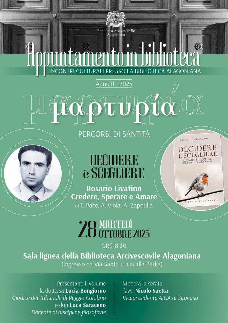 Martedì 28 ottobre alle ore 18.30, nella sala lignea della Biblioteca Arcivescovile Alagoniana (ingresso da via Santa Lucia alla Badia) a Siracusa, sarà presentato il volume “Decidere è scegliere. Rosario Livatino. Credere, Sperare e Amare” di Tommaso Pace, Anna Viola e don Andrea Zappulla.