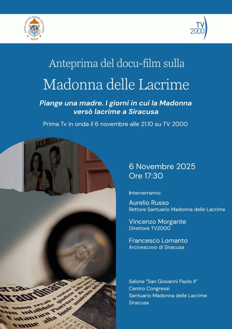 Giovedì 6 novembre, alle ore 17.30, nel centro congressi del Santuario Madonna delle Lacrime, la presentazione in anteprima del docufilm sulla Madonna delle Lacrime “Piange una madre. I giorni in cui la Madonna versò lacrime a Siracusa“. Interverranno don Aurelio Russo, rettore del Santuario della Madonna delle Lacrime; Vincenzo Morgante, direttore di Tv 2000; mons. Francesco Lomanto, Arcivescovo di Siracusa. La messa in onda in prima Tv avverrà sempre giovedì 6 novembre alle 21.10 su Tv2000.