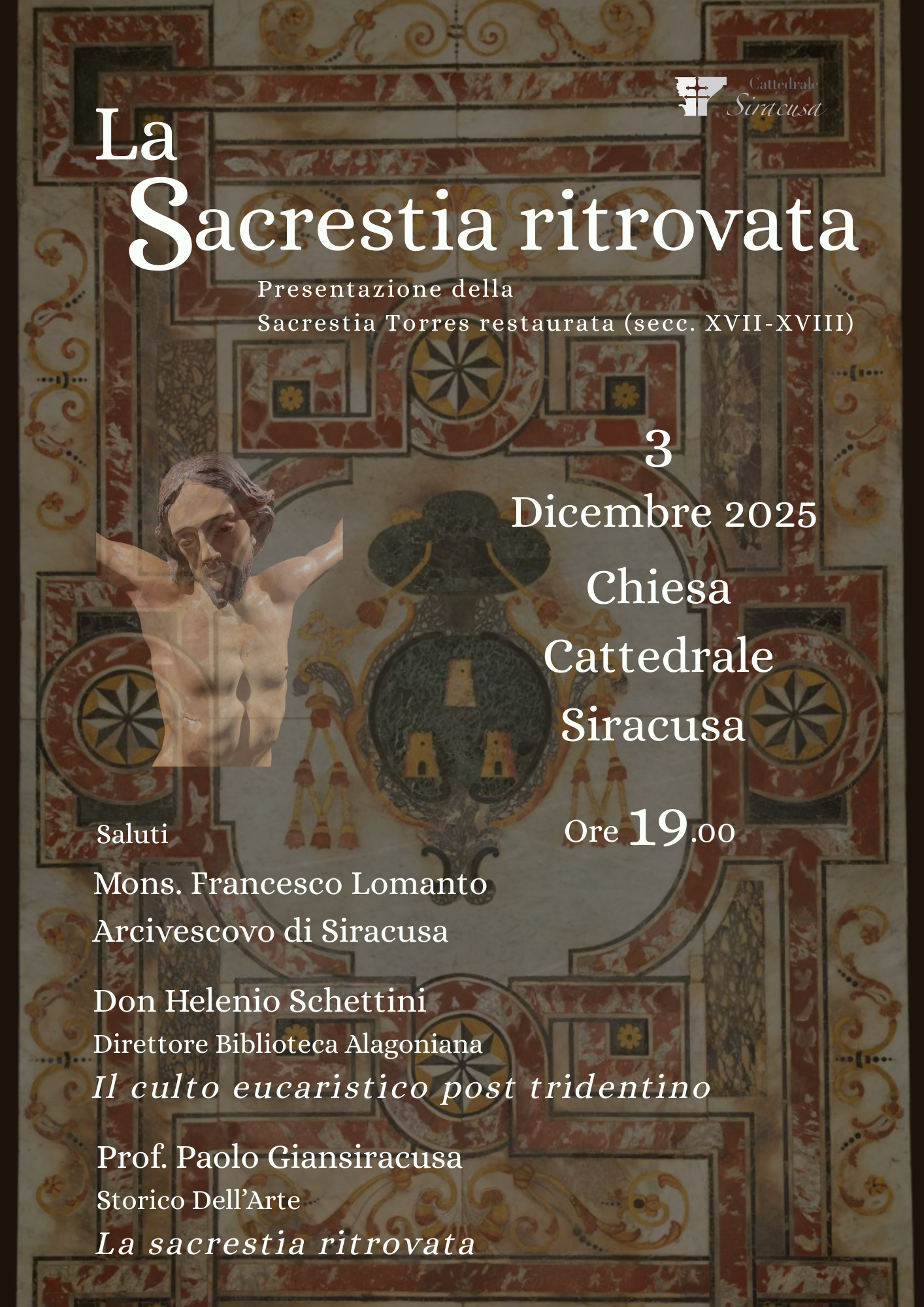 Mercoledì 3 dicembre alle ore 19.00 nella Chiesa Cattedrale a Siracusa, presentazione della Sacrestia Torres restaurata (secc. XVII – XVIII).