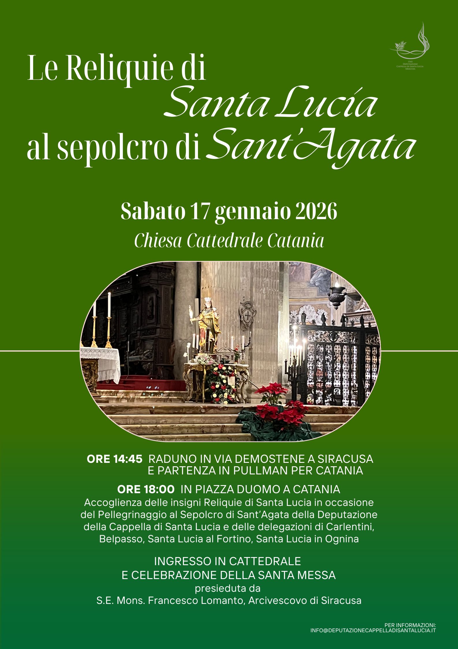 Sabato 17 gennaio, la Deputazione della Cappella di Santa Lucia ha promosso il tradizionale pellegrinaggio di Santa Lucia al Sepolcro di Sant’Agata a Catania. Alle ore 18.00 in piazza Duomo a Catania, accoglienza delle insigni reliquie di Santa Lucia in occasione del Pellegrinaggio al sepolcro di Sant’Agata della Deputazione della Cappella di Santa Lucia e delle delegazioni di Carlentini, Belpasso, Santa Lucia al Fortino e Santa Lucia in Ognina.