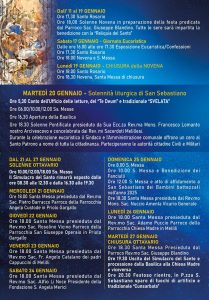 A Melilli martedì 20, solennità liturgica di San Sebastiano, alle 5:30 canto dell’ufficio delle letture, del Te Deum e tradizionale svelata. Alle 16:30 apertura della Basilica.