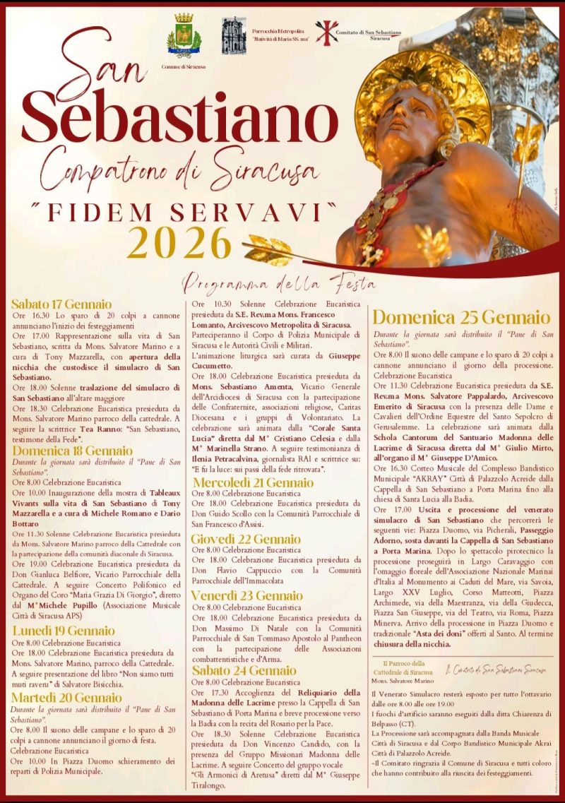 Martedì 20 gennaio, San Sebastiano, di mattina schieramento dei reparti della Polizia Municipale. Seguirà la solenne celebrazione presieduta dall’arcivescovo Francesco Lomanto, alla presenza delle autorità civili e militari.