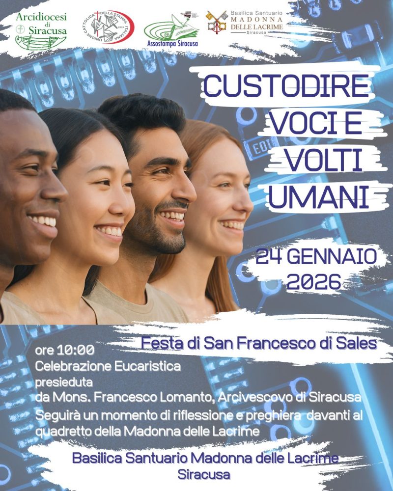 Sabato 24 alle ore 10.00, nella Basilica Santuario Madonna delle Lacrime a Siracusa, celebrazione eucaristica presieduta da mons. Francesco Lomanto, arcivescovo di Siracusa e delegato per le Comunicazioni sociali della Conferenza Episcopale Siciliana. Seguirà un momento di riflessione e preghiera davanti al quadretto del Cuore Immacolato di Maria. Saranno presenti mons. Maurizio Aliotta, direttore dell’Ufficio per la Pastorale delle Comunicazioni Sociali e la Cultura; don Aurelio Russo, consulente ecclesiastico Ucsi Siracusa; Alberto Lo Passo, presidente provinciale Ucsi Siracusa; Prospero Dente, segretario Assostampa Siracusa.