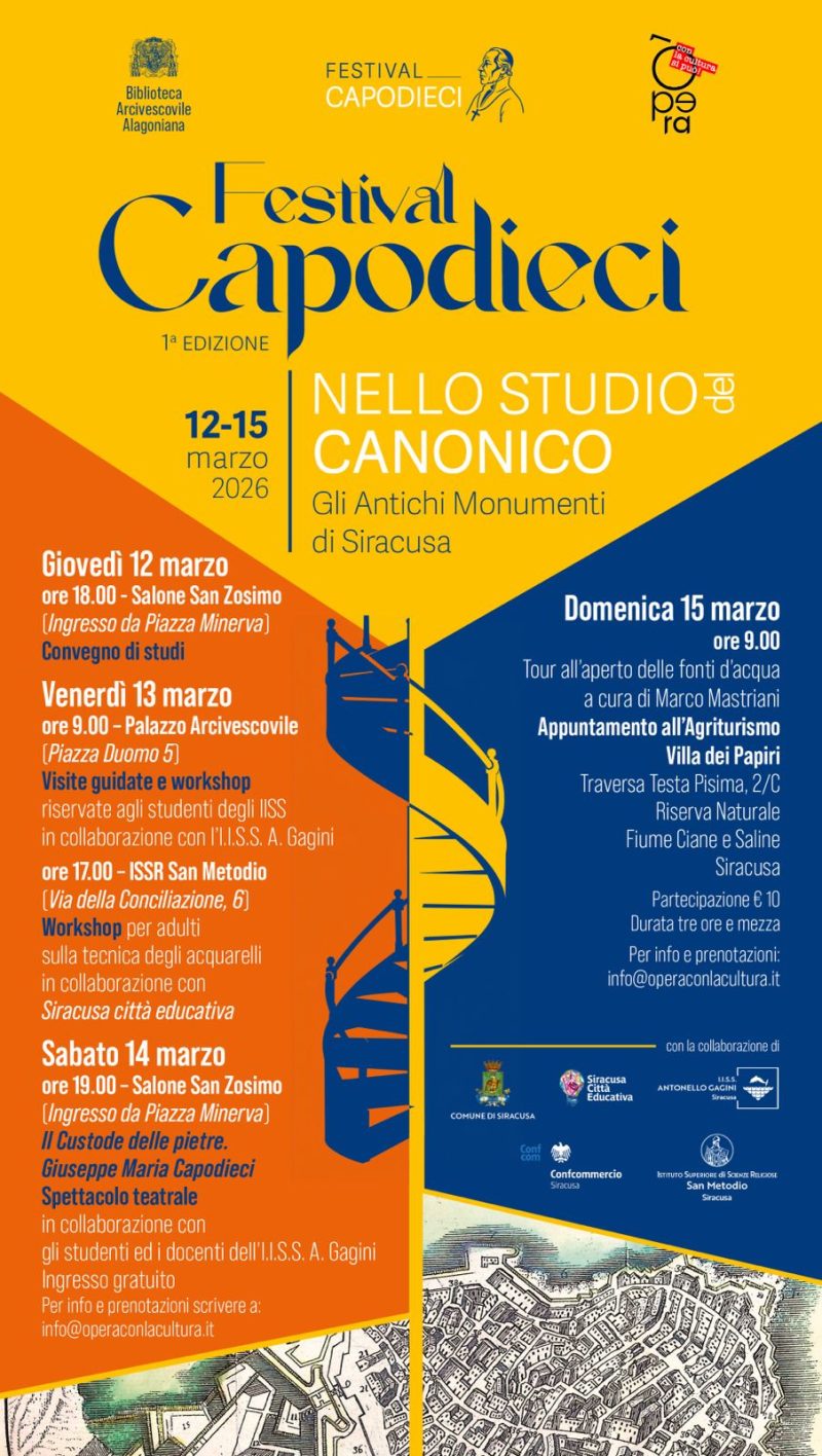 La rassegna è organizzata dalla Biblioteca Arcivescovile Alagoniana in collaborazione con l’associazione culturale Opera, il sostegno della Confcommercio Siracusa e del Comune di Siracusa che per l’occasione sosterrà lo spettacolo teatrale Il custode delle pietre, Giuseppe Maria Capodieci.