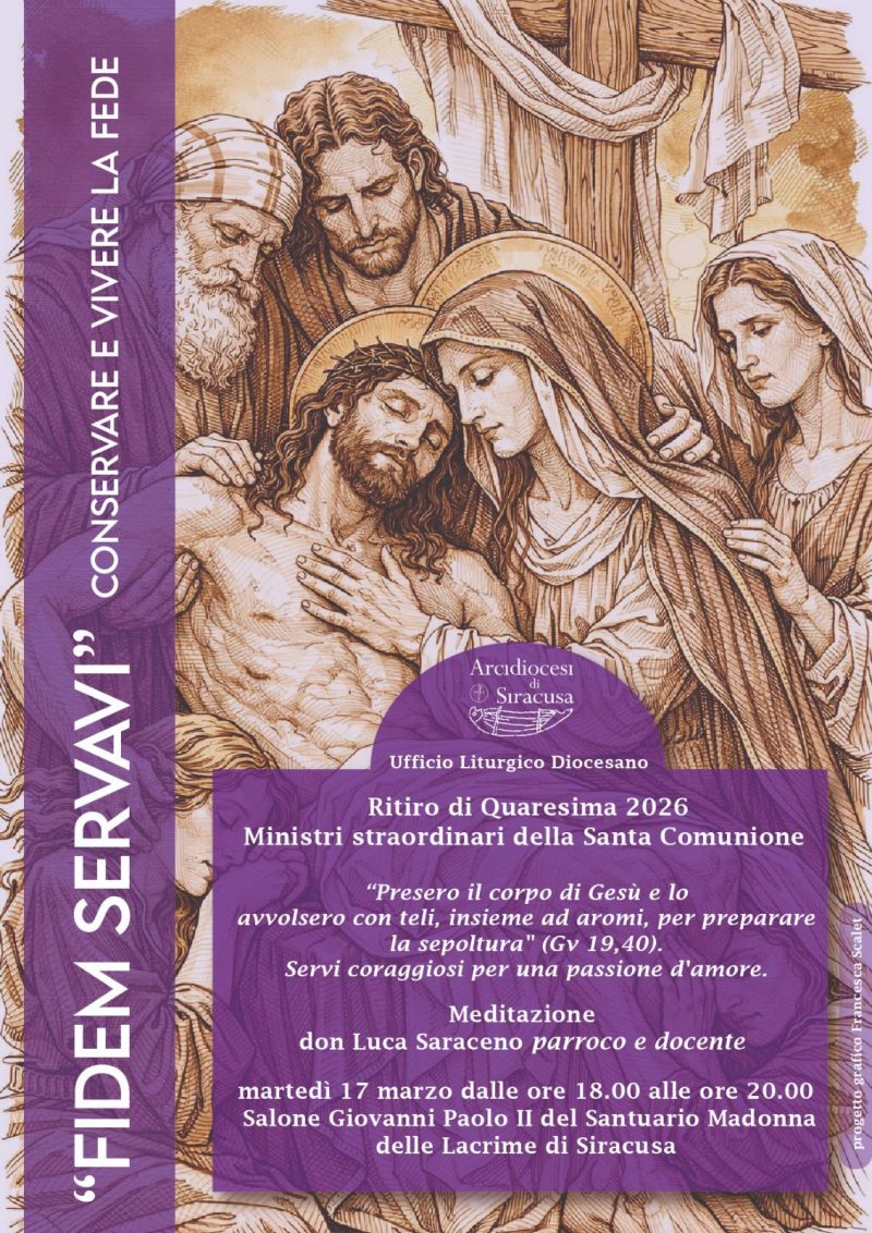 Martedì prossimo, 17 marzo, dalle ore 18.00 alle ore 20.00, si terrà il ritiro di Quaresima dei Ministri Straordinari della Santa Comunione presso il Salone Giovanni Paolo II del Santuario Madonna delle Lacrime di Siracusa.