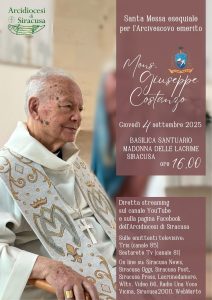 Venerdì 5 settembre, alle ore 10.00, in Cattedrale, sarà celebrata una Santa Messa in suffragio dell’Arcivescovo. Uniamoci tutti nella preghiera, grati per il fecondo Ministero dell’amato Pastore. L’Arcivescovo mons. Giuseppe Costanzo ha servito la Chiesa siracusana dal 1989 al 2008.